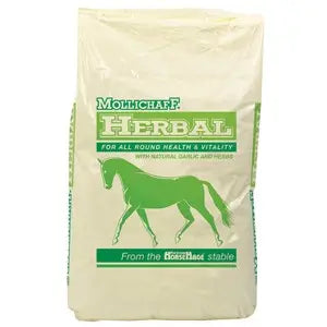 Mollichaff Herbal is a high quality chaff made from oat straw which has been enriched with a variety of herbs that are found in the horses natural environment. Only a light dressing of molasses is needed in this mix, this is due to the herbs giving the oat straw a more appetising flavour & aroma that horses enjoy. A balanced mix of garlic, mint, rosemary & golden rod provide benefits to the digestive system, respiratory system, taste & overall nutritional quality of the chaff.