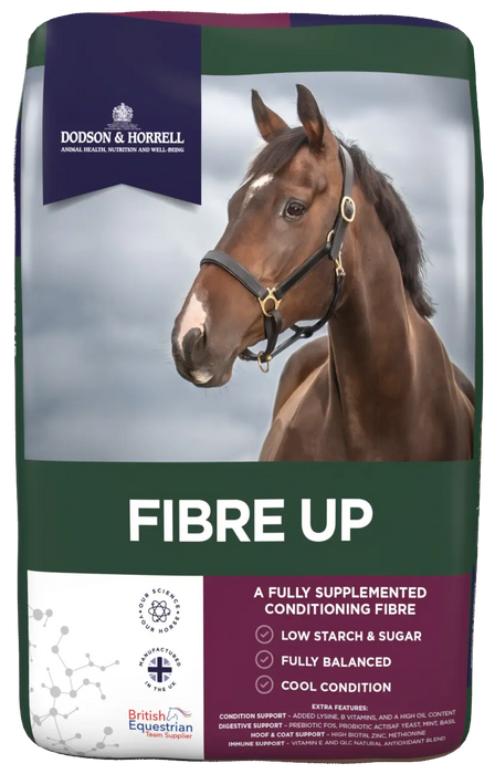 Dodson & Horrell Fibre Up. Fibre Up is an appetising, all in one, fully balanced conditioning fibre feed that supports healthy digestion! It is low starch and sugar for ‘cool condition’ and contains quality protein to support muscle and top line with oil and B vitamins to build condition. Fibre Up contains digestive support, hoof & coat support as well as immune support!