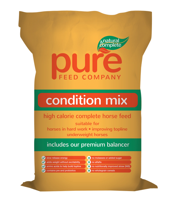 Pure Condition is low starch so it is also suitable (alongside ad lib forage) for horses that have had gastric ulcers.