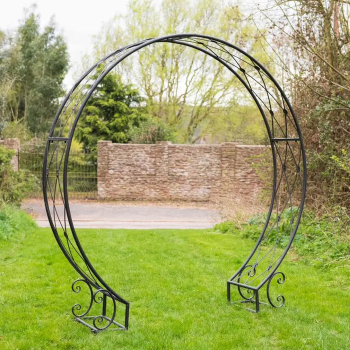 Perfect for creating an inviting entryway or a striking floral display, this graceful moon gate in bronze is a stylistic and structural delight. Breath-taking as a stand alone piece, it can also provide beautiful support for climbing plants.