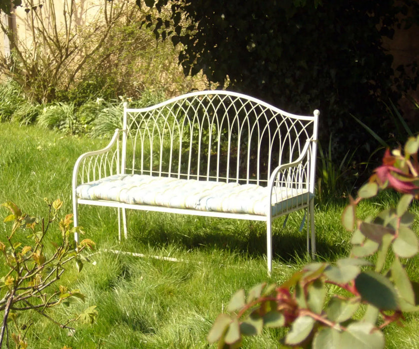 The refined Hampton bench is characterised by its gothic arches and graceful lines. Steel with cream powder coating, it comes pre-assembled, but folds flat for easy storage when not in use.