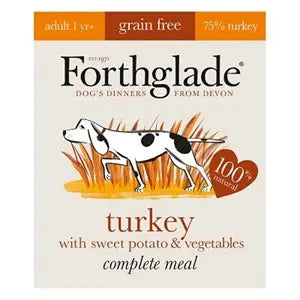 Forthglade Complete Turkey Sweet Potato & Veg Grain Free wet Dog Food. Naturally low in fat and tail-waggingly tasty our nutritionally balanced grain free turkey recipe is free from junk & fillers, easy to digest and contains everything your dog needs to thrive.