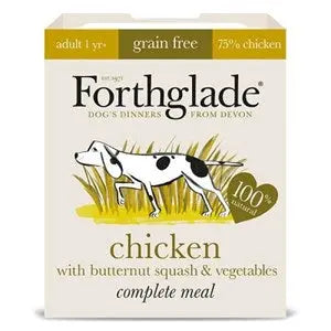 Forthglade Complete Grain Free Chicken with Butternut Squash & Vegetables Adult Dog Food. Hypoallergenic and gentle on sensitive tummies, our grain free chicken recipe is packed with 75% chicken along with a healthy mix of vegetables to keep your four-legged friend happy and healthy. Free from grains, junk, fillers, artificial colours, flavours & preservatives, our recipe uses only natural ingredients with added vitamins & minerals.