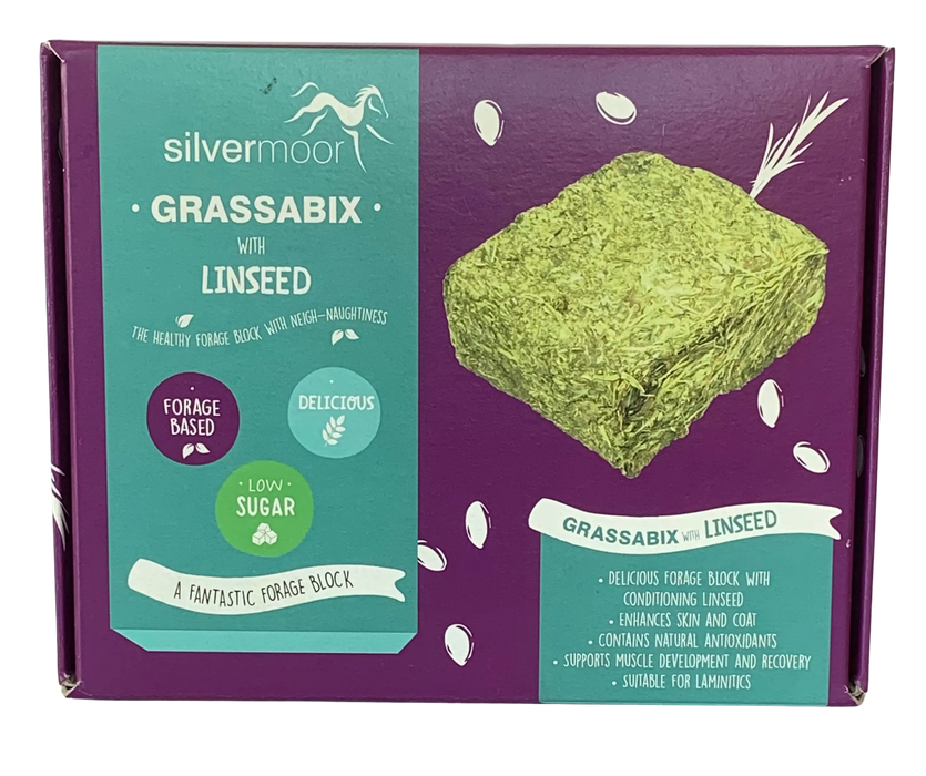 Silvermoor Grassabix with Linseed. Grassabix with Linseed is the healthy 1kg dried grass forage block with neigh-naughtiness. This tasty treat for horses and ponies has added conditioning linseed which enhances skin and coat, contains natural antioxidants and supports muscle development and recovery, as well as being suitable for laminitics. It can be used as a treat, boredom buster or as a forage replacement, and can be fed directly from the bag or soaked in water to create a delicious mash. These yummy blocks have been compressed for easy feeding, storage and handling. Low sugar and low starch levels mean this projduct is suitable for good doers and laminitics.
