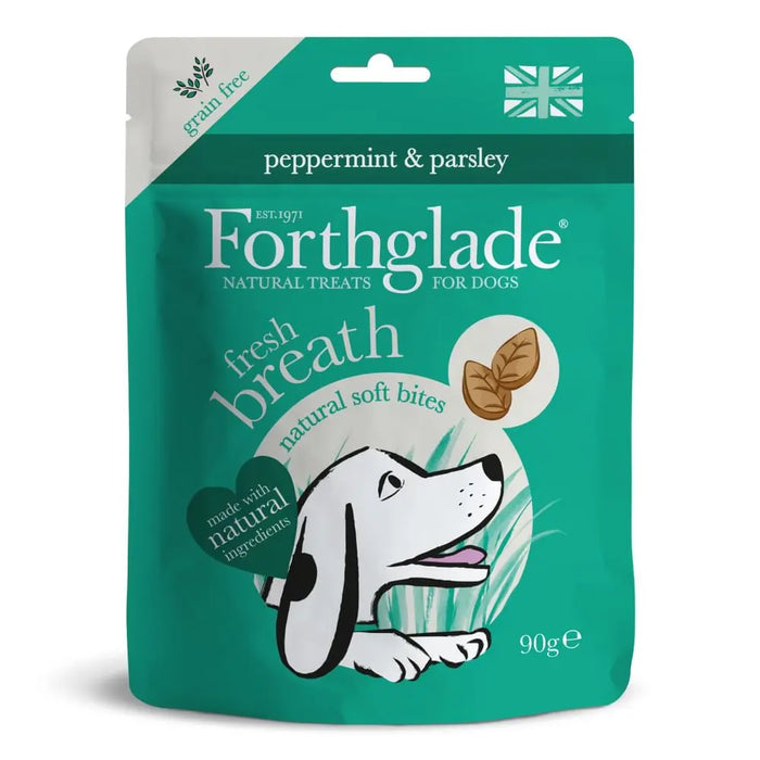 Forthglade Natural Soft Bites Fresh Bites Peppermint & Parsley Treats the perfect way to start the day. Part of our growing range of soft bites, our fresh breath treats are made with peppermint and parsley to help freshen your dog's breath as part of a balanced dental care regime. Start your dog's day with a burst of freshness. Packed full of natural ingredients, grain free and completely free from artificial colours and preservatives, these treats are a tasty addition to your dogs day. Suitable for dogs aged 2 months +, these fresh breath treats are gentle on tummies and easy to break into smaller treats for puppies and easier portion control. They're the perfect way to start your dog's day, for occasions you want to reward or for quieter moments to help nourish your relationship with your four-legged friend.