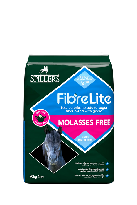 Spillers Fibre Lite Molasses Free. Low calorie, no added sugar fibre blend with garlic. Low calorie fibre blend suitable for all horses and ponies. Includes short chopped alfalfa and straw to help slow eating time. Molasses free, no added sugar recipe. Low in sugar and starch to support digestive health; ideal for horses and ponies prone to excitability. With added grass nuts and real garlic for enhanced variety and taste. Ideal for feeding alongside compound feeds and balancers.
