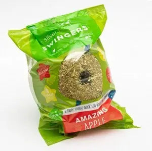 Silvermoor Swingers Amazing Apple Grass Treat Ball is the innovative design attaches to the rope (which can be bought separately) and is hung from a height in your stable. There are no corners so your horse will not be able to grab at it and gobble it down. The unique swinging design means the horse has to work to be able to eat it. This means it cannot be eaten quickly and will take longer to eat than similarly sized traditional blocks of forage. Eating regularly promotes saliva production which buffers stomach acids and helps prevent against gastric ulcers. Silvermoor Swingers are low in sugar and low in starch. They provide a healthy addition to be used to compliment the horses’ diet and can help manage weight. They are safe to use for laminitics and good doers as well as insulin resistant horses and those suffering from EMS.