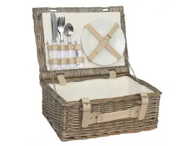 Full antique wash finish willow - cream faux leather - white handled cutlery - cotton lining