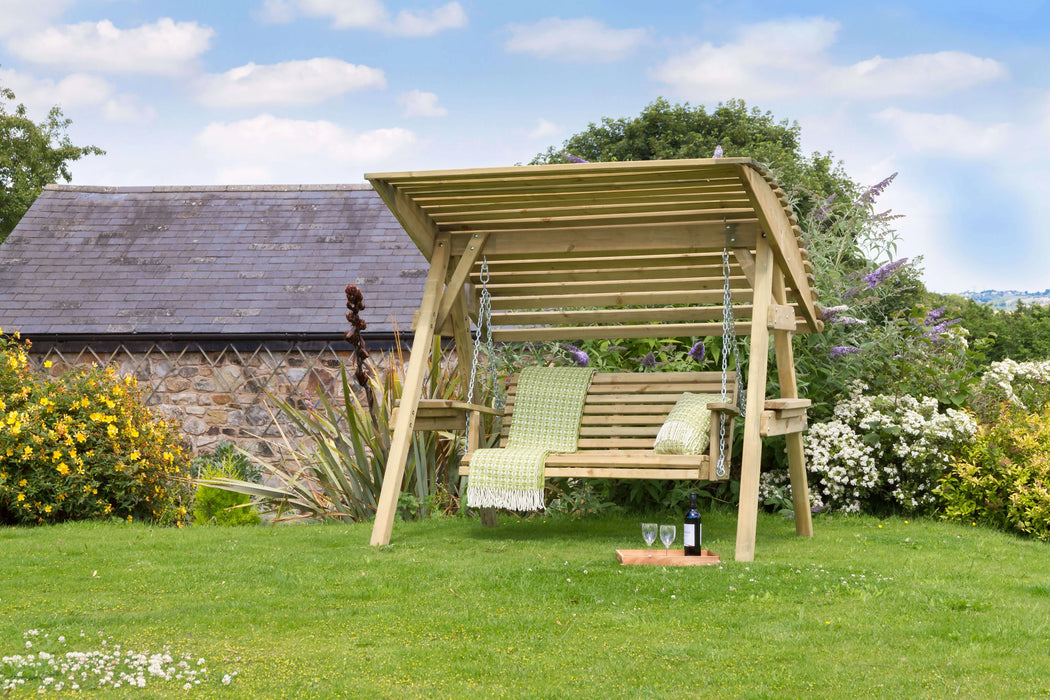 The luxurious Miami 2 Seater Swing comes with a fixed wooden canopy and a comfortable swing seat. Two removable shelves that easily slot onto the swing's armrests are perfect for summertime drinks.