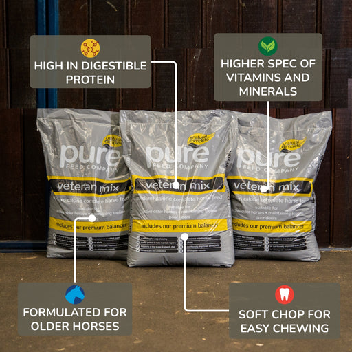 Pure Feed CompanyPure Feed Company Pure Veteran Mix is formulated for senior horses that need extra help maintaining condition or are still in regular work. It prov...