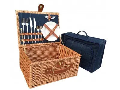 Willow Direct2 PERSON BLUE TWEED HAMPER Full light steamed willow - tan real leather - stainless steel cutlery - removable cooler bag CONTENT 2 x 7" Porcelain...