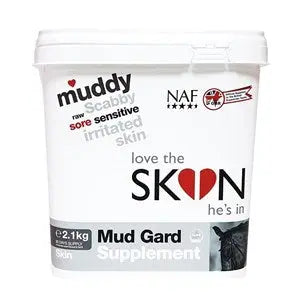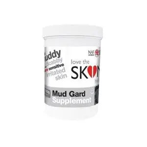 NAF Mud Guard - Love the Skin He's in - is a highly innovative nutraceutical combining over 50 ingredients. it helps to keep your horses skin free from problems casued by wet muddy conditions. It is for the systemic support of skin exposed to wet muddy conditions. Recommended for use in conjunction with Teatree Oil Shampoo Mud Guard Ointment and MSM Ointment.