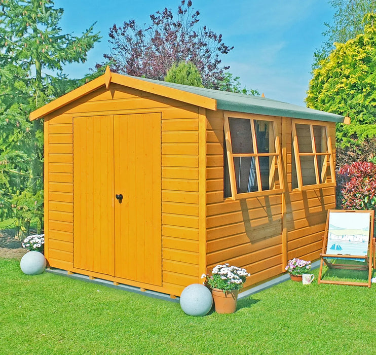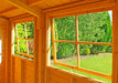 The floor has 16mm strong tongue and groove and the roof has 12mm tongue and groove . The attractive two opening windows are storm resistant, joinery quality frames glazed with 3mm glass. Doors and windows are both pre-hung for ease of assembly. All of the timber is sourced only from very slow grown, high grade, FSC approved, European pine. The building is treated with a basecoat treatment ready for top coating by you immediately after installation. (Imperial dimensions are approximate to the nearest foot, please refer to the exact metric dimensions in the data given). Allowance should be made for the roof overhang and for access around the outside during construction and subsequent treatment.