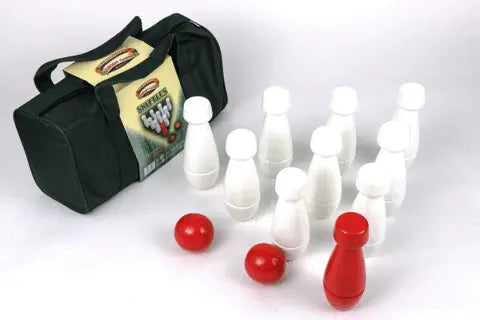 10 x Skittles (21cm). 2 x balls. Canvas carry bag. Full instructions.